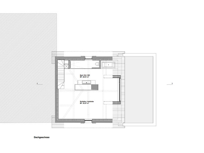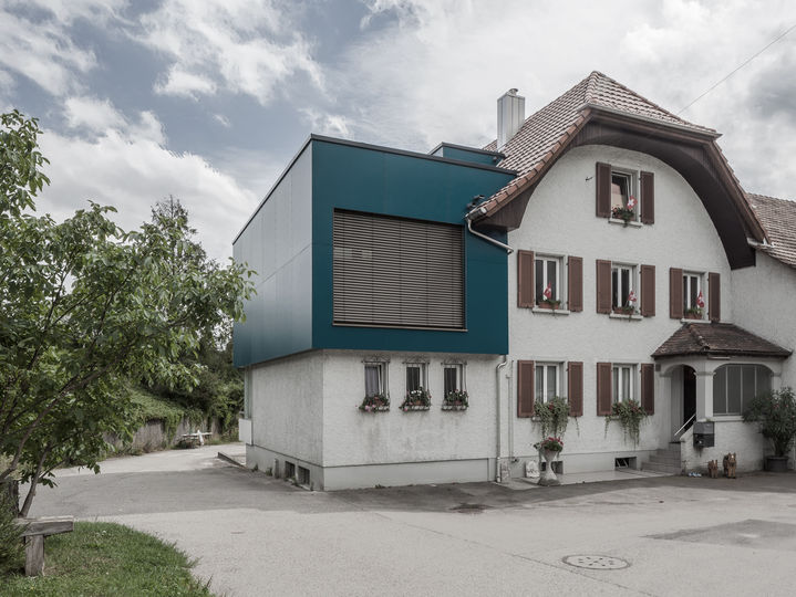 das bestehende bauernhaus mit grosszügigem noch unausgebautem dachbereich wurde mit einem markanten gebäudevolumen erweitert. die aufstockung, als moderner farbiger kubus, wird auf die bestehende terrasse aufgesetzt. der neue körper setzt sich in form und volumetrie auf allen seiten von der bestehenden bausubstanz ab und verstärkt dadurch den kontrast zwischen neu und alt. der petrolfarbene körper wird mit zwei öffnungen im norden und süden ausgestattet. im dachbereich bleibt die bestehende tragstruktur mit alten holzbalken und backsteinwänden klar ersichtlich und im vordergrund. die restlichen flächen werden mit weissem glattstrich in den hintergrund gedrängt.