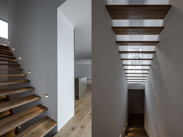 in biberist entstand ein efh – wohnhaus mit einem betonierten steildachvolumen. der dynamische und zugleich zurückhaltend wirkende wohnkubus wird auf dem flachen grundstück gegen südwesten ausgerichtet. zwei einschnitte lassen die aussenbereiche mit sitzplatz und eingang entstehen. als kontrast werden diese beiden einschnitte mit einer dunkleren farbe differenziert. der reduzierte gebäudekörper wird durch eine glatte und feine kompaktwärmedämmfassade monolithisch dargestellt. die raumaufteilung gliedert sich in einen offenen, grosszügigen bereich mit essen und wohnen im erdgeschoss sowie den privaten bereich mit schlaf- und kinderzimmern im oberen geschoss.