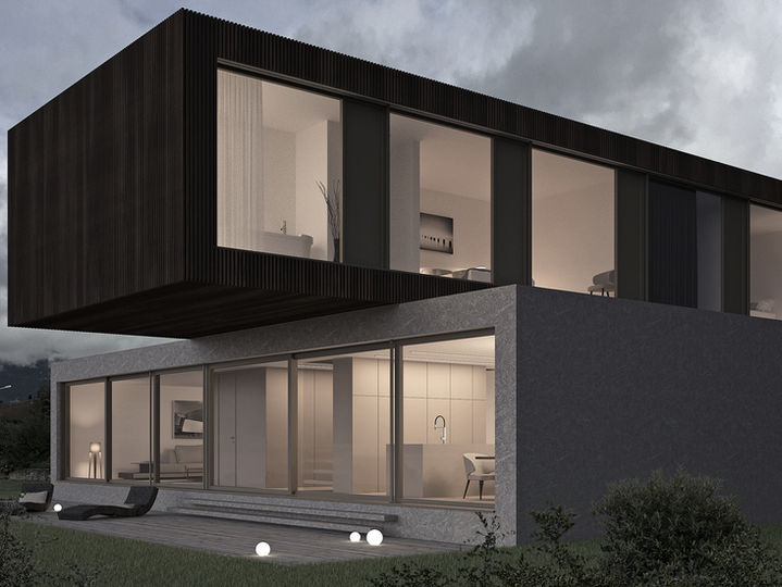 an schöner wohnlage in deitingen entsteht ein dynamisches gebäudevolumen mit markanten auskragungen. der wohnkubus mit den verschobenen zwei geschossen wird pragmatisch auf dem flachen grundstück gegen süden platziert und gezielt gegen den sonnenverlauf ausgerichtet. der aufgesetzte schwebende kubus wird um 90 grad gedreht und orientiert sich somit gegen westen und osten. die beiden kuben werden somit klar in einen öffentlichen teil (erdgeschoss) und privaten teil (obergeschoss) getrennt. die starken kontraste von beton und holz sollen diese übereinander gestapelten kuben noch stärker zum ausdruck bringen. erdgeschoss massiv als sichtbetonkörper mit osb – schalstruktur und das obergeschoss schwebend als holzkörper mit vertikaler lamellenstruktur. durch die grosszügigen auskragungen entstehen gedeckte aussenbereiche. im erdgeschoss gelangt man über drei tritte elegant in die gartenebene, welche zugleich carport mit eingang und loggia mit sitzplatz beherbergt. im innenbereich wird die erdgeschossebene mit wohnen und essen durch den innenkern unterteilt. dieser besteht aus eingang, garderobe, treppe, nassbereich und kochen. durch die gleichwohl umlaufende erschliessungszone wird ein loftartiger wohncharakter geschaffen. die grosszügige raumhöhe mit beinahe drei meter, kommt im erschliessungsbereich mit den freischwebenden, inszenierten treppenstufen aus massivholz, optimal zur geltung. hier entsteht ein zweigeschossiger atriumbereich welcher für eine verschmelzung der unterschiedlichen geschossebenen sorgt. die privaten schlafräume mit masterbedroom, ankleide, nasszonen und kinderzimmer befinden sich somit im oberen geschoss und geniessen volle privatsphäre.